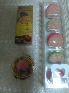 添付している画像は、担当さんの台湾旅行土産の手鏡とチョコ♪トークショーのお土産のキラキラマカロン♪